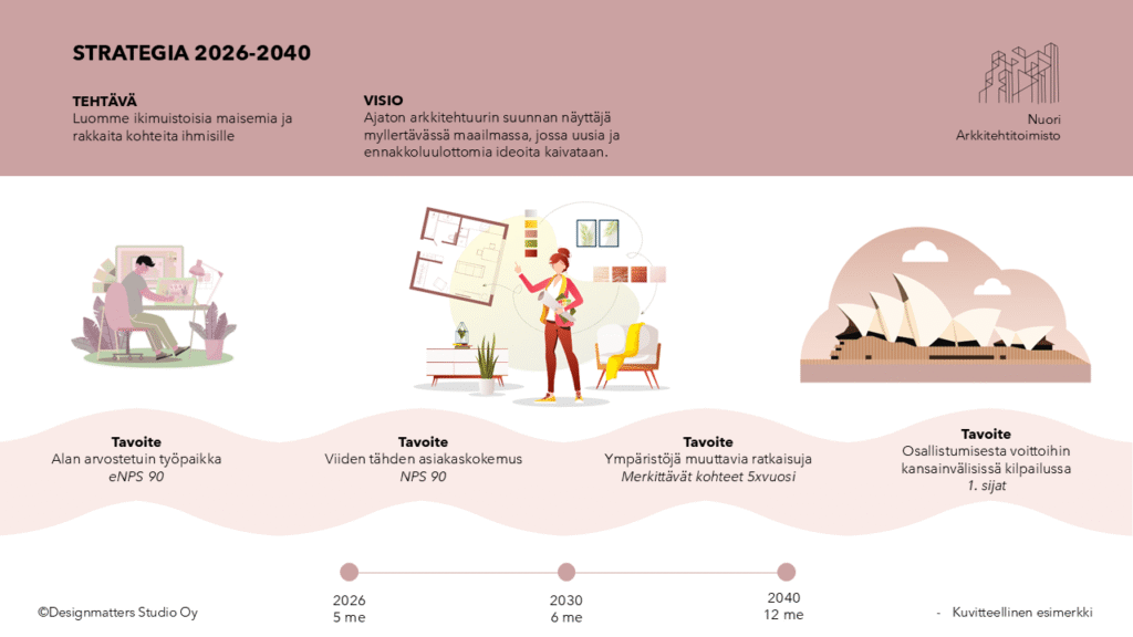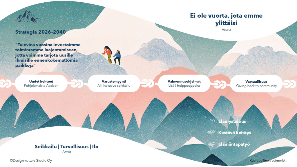 Alla on kolme esimerkkiä Designmatters Studion toteuttamista kuvitteellisista strategiakuvista: